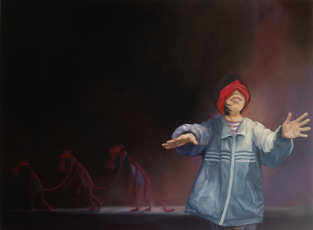 My favorite canvas is the large one below with its blindfolded child and familiar cartoon character.